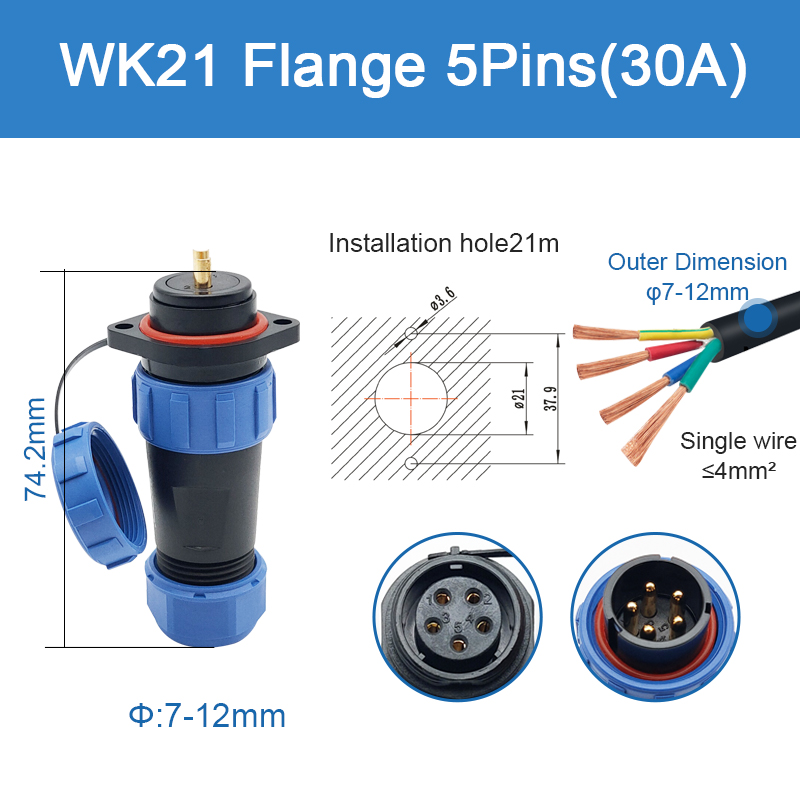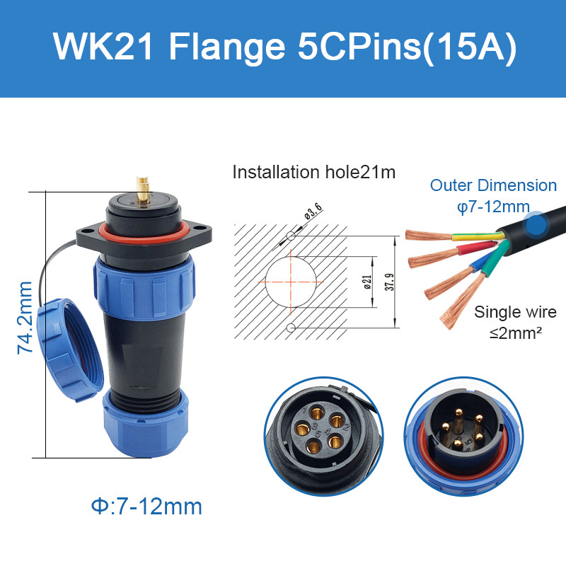 WK21 Series Connector, straight standard type, 2 hole flange socket and plug, solder contact, 7 Pin With its IP68 rating, each product is excellent within harsh environments. Easy quick connect and disconnect coupling. High cost-effective with good quality.